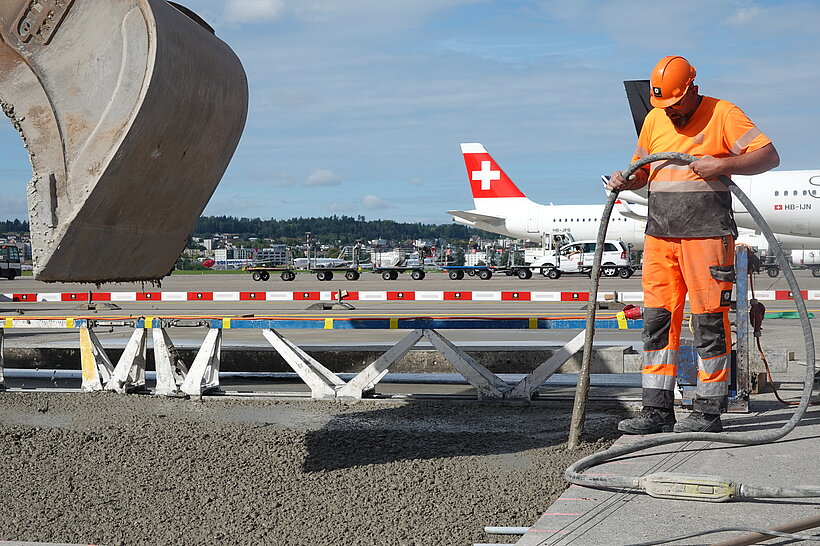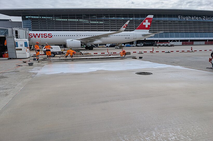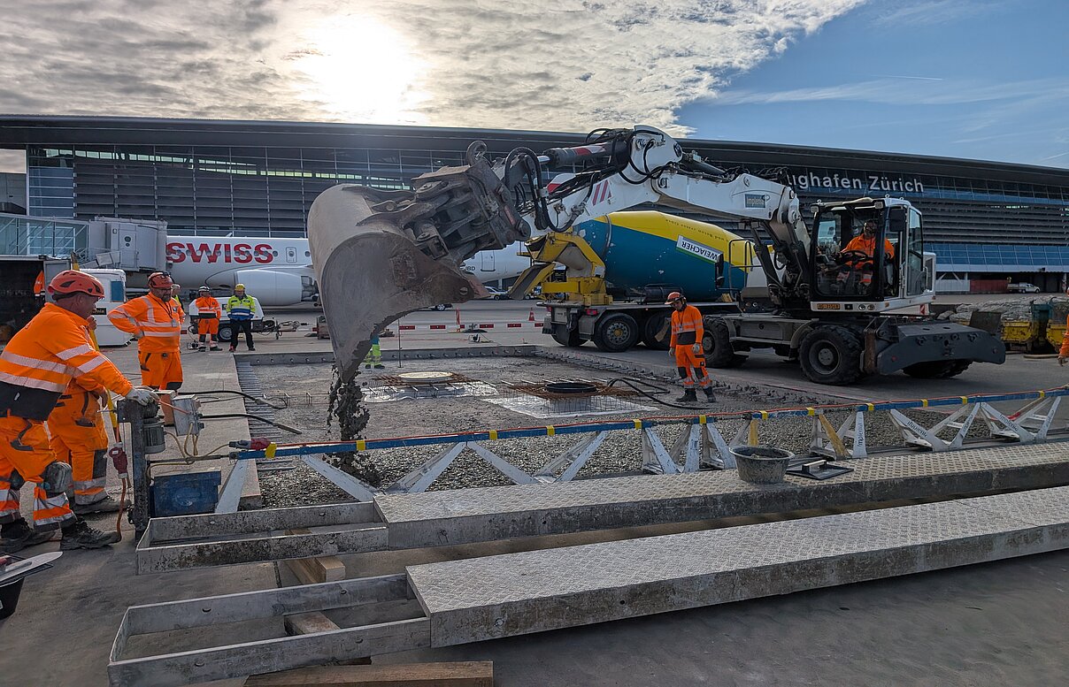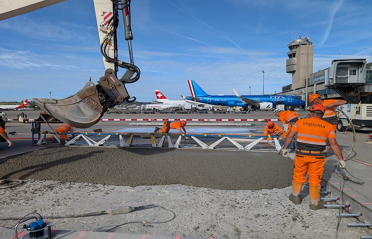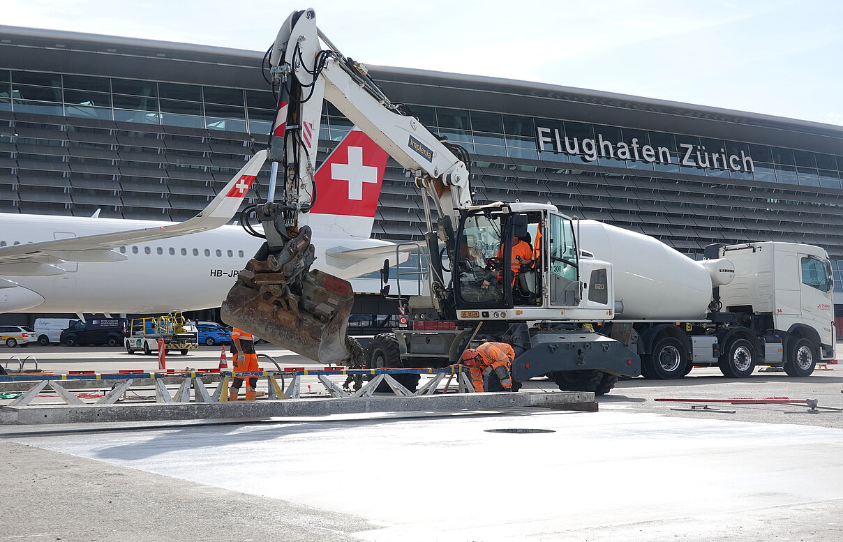 Auch im Jahr 2025 wurden am Flughafen Zürich (ZRH) zwischen Juni und September zahlreiche Betoninstandsetzungen an den Flugbetriebsflächen durchgeführt sowie diverse Kanten und Fugen mit Concretum® Q-CON erneuert. Wie in den Vorjahren standen dabei die nächtlichen Sperrfenster von wenigen Stunden im Mittelpunkt, um den Flugbetrieb nicht zu beeinträchtigen und gleichzeitig die Sicherheit sowie den langfristigen Werterhalt der Pisten und Rollwege sicherzustellen. Während dieser kurzen Zeitfenster wurden mehrere Betonplatten mit dem Schnellbeton Concretum® Q-FLASH 2/20 ersetzt, der sich dank seiner schnellen Festigkeitsentwicklung und hohen Verarbeitbarkeit seit Jahren bewährt. Die Bauarbeiten dauerten jeweils nur wenige Stunden, wobei der Beton bereits nach rund zwei Stunden die erforderliche Frühfestigkeit von mindestens 16 N/mm² erreichte. Dadurch konnten die betroffenen Flugbetriebsflächen jeden Morgen pünktlich wieder für den regulären Betrieb freigegeben werden.