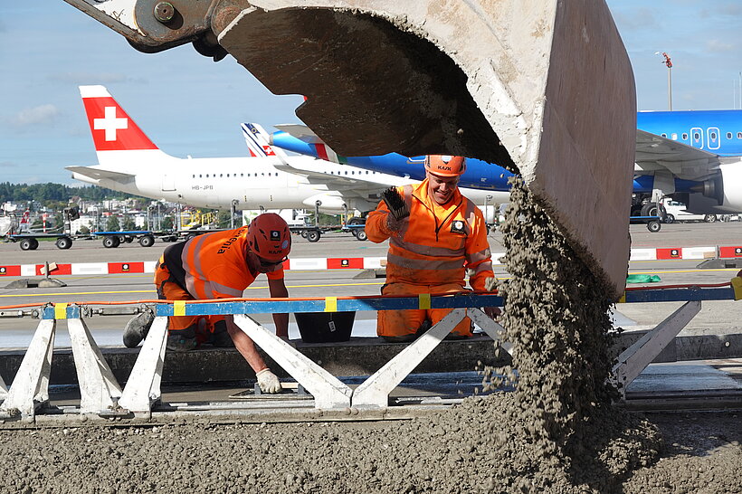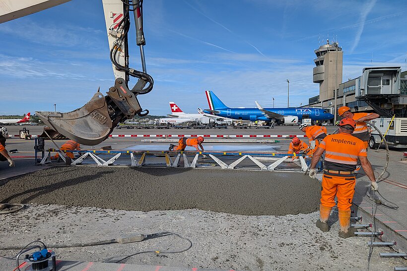 Ein besonderes Highlight und gleichzeitig eine Premiere stellte in diesem Jahr eine rund 12 Stunden dauernde Sperre von 18:00 Uhr bis 06:00 Uhr dar, in denen die Leitungen unter der Taxiway Alpha Querung erneuert wurden. Während dieses Zeitfensters wurden in einer Tag-/Nacht-Etappe 100 m³ Concretum® Q-FLASH 2/20 eingebaut – ein logistisch wie technisch anspruchsvoller Einsatz, der präzise Planung, eine optimierte Produktionskette und zuverlässige Materialeigenschaften erforderte. Dank der konstanten Verarbeitungszeit von rund 60–90 Minuten und der schnellen Erhärtung war es möglich, auch bei dieser grossen Menge die nachfolgenden Arbeitsschritte wie Rillieren und Fugenverguss rechtzeitig abzuschliessen.